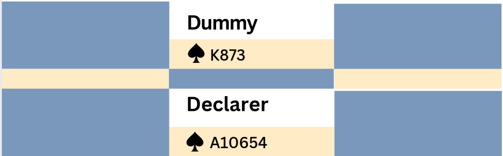 When you lead low to dummy’s King, West plays the Jack (or Queen), East a low card. When you now play dummy’s seven, East follows with the remaining low card. Is it a toss-up between finessing the ten, and playing the Ace? Typical players tend to think this decision is a toss-up, and advanced players know better, so this is a situation in which advanced players win a lot of matchpoints. In the example situation, the finesse is about twice as likely to succeed. When you face this sort of decision at the table, there are two lines of thinking that will point you to the correct answer: