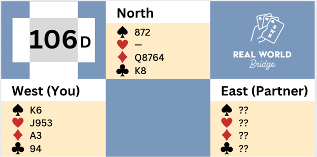 Against three spades, you led the ten of clubs (seven, six, Queen. You placed declarer with 6-8 HCP and concluded that partner was encouraging in clubs. Declarer plays the four of hearts (two, Ace, six). Now the deuce of diamonds from dummy (five, nine and you win the ten). This position remains: