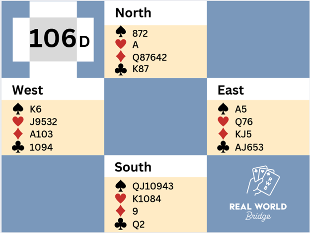 Bonus from Val: The defense is easier if partner puts in the Jack of diamonds at trick three; now it’s easier for partner to continue two rounds of trumps, than for you to find the trump shift from your side of the table. Deal D20.