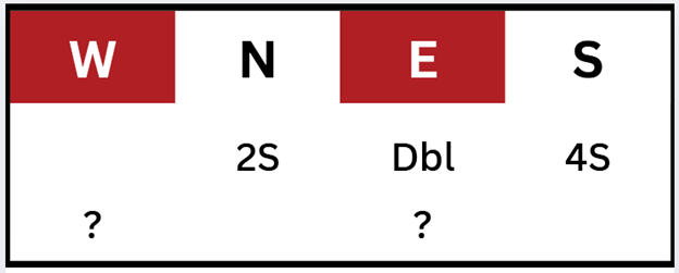 East’s Call if West Doubles Four Spades? In our partnership, West’s double would promise at least two big cards, so East (vulnerable versus not) can expect good chances to make a contract at the five level; if that’s possible, then plus 600 and plus 620 will score a lot better than plus 100 or plus 300 against four spades doubled. In many advanced partnerships, a four notrump call by East would promise at least two places to play; West would bid West’s lowest four card suit. East has a difficult decision, and that’s one benefit of South making ‘the pressure bid’ of four spades.