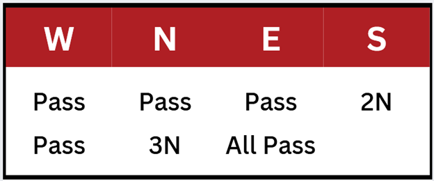 Declarer’s opening bid promised 20-21 HCP. Partner leads the nine of spades (four, Jack, five). There’s something to be said for switching to a heart, but say that you return the three of spades (six, eight, King).