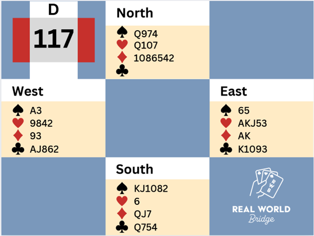 Bonus from Val: Double dummy, East can take thirteen tricks: Ace of spades, heart to the Jack, Ace-King of hearts, King of clubs, club finesses. If declarer starts Ace of spades, Ace-King of hearts, declarer takes eleven tricks. But many players might have followed declarer’s actual line of play. Deal C104.