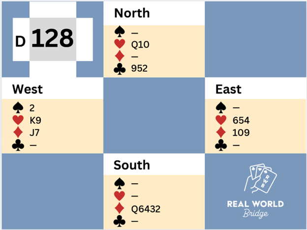 Will you play a heart, or will you ruff? Perhaps because this is a quiz, probably you figured out that you need to ruff. To see why, have a look at this updated diagram, showing the position when West is about to lead the last spade (five cards remain, declarer has won four tricks and lost four):
