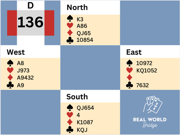We sat EW. Against three diamonds, West led a low trump, now a club to the King and West’s Ace, and West continued Ace of trumps and a trump. From this point, declarer twisted and turned but ended down two (six tricks for EW). Any plus score EW was 76% or better; our plus 100 was 93%. West’s initial pass worked out well; those who overcalled two diamonds played it there, typically going down three (taking the same six tricks on offense that we took on defense) or down four (West taking only five tricks). Those who doubled one spade sometimes pushed NS to four diamonds (good) but sometimes ended in four hearts doubled down one (scoring a not-bad 52%) or down two (scoring a very bad 4%). If hearts had been 2-2, it would have been possible to make ten tricks in hearts, but on this layout declarer has only nine tricks at best. Deal L069.